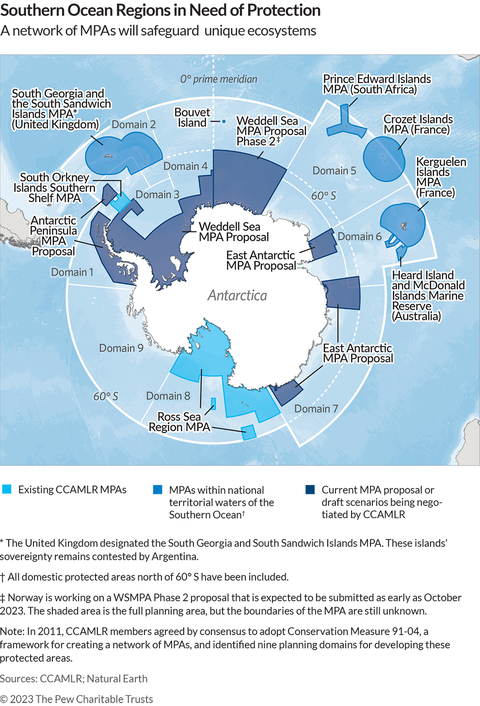 In 2009, CCAMLR members pledged to create “a representative network of MPAs” in the Southern Ocean. The body established MPAs on the southern shelf of the South Orkney Islands that year and in the Ross Sea in 2016. But four proposed MPAs in the Weddell Sea, East Antarctica and the Antarctic Peninsula have been at a standstill for years, due to repeated vetoes by the Chinese and Russian delegations.